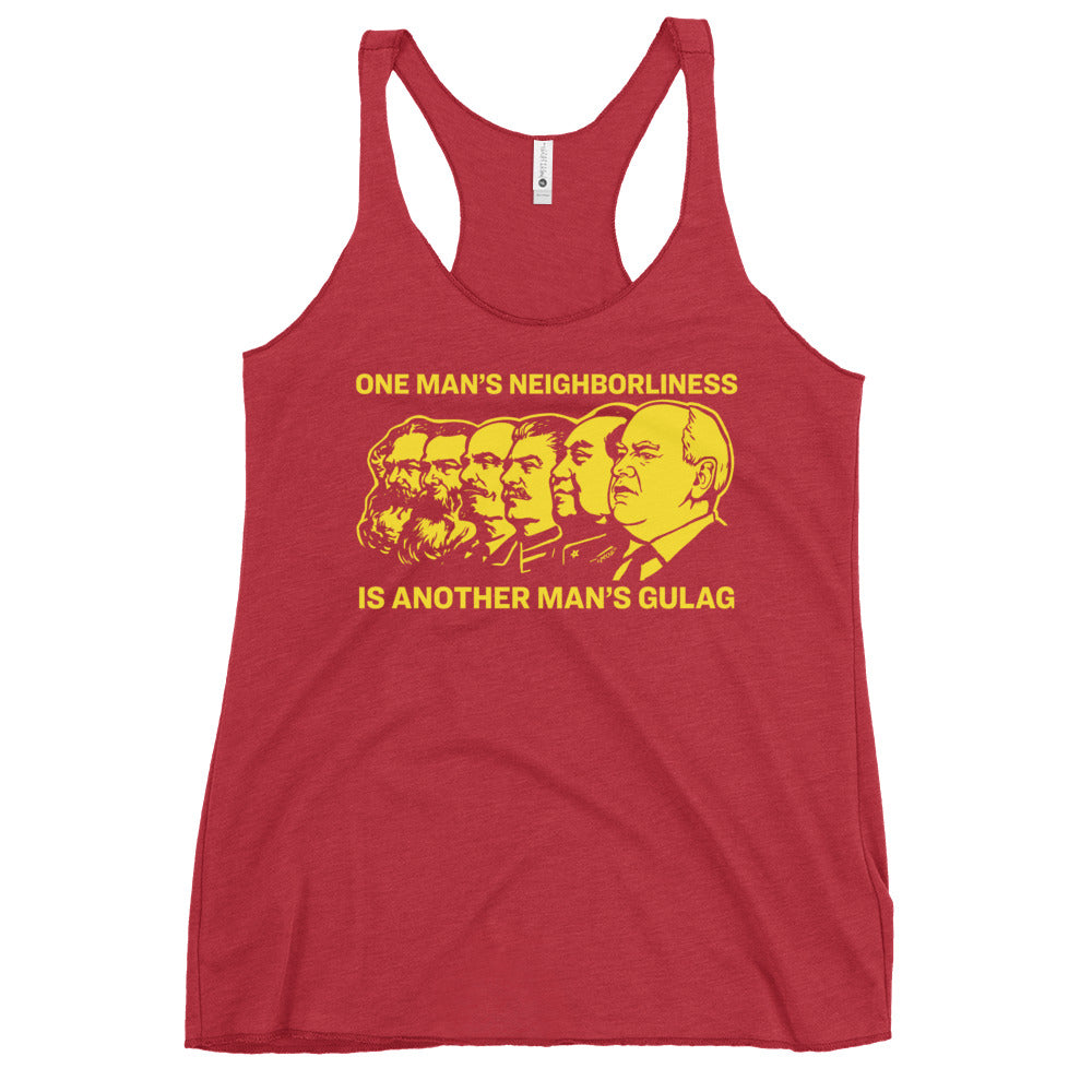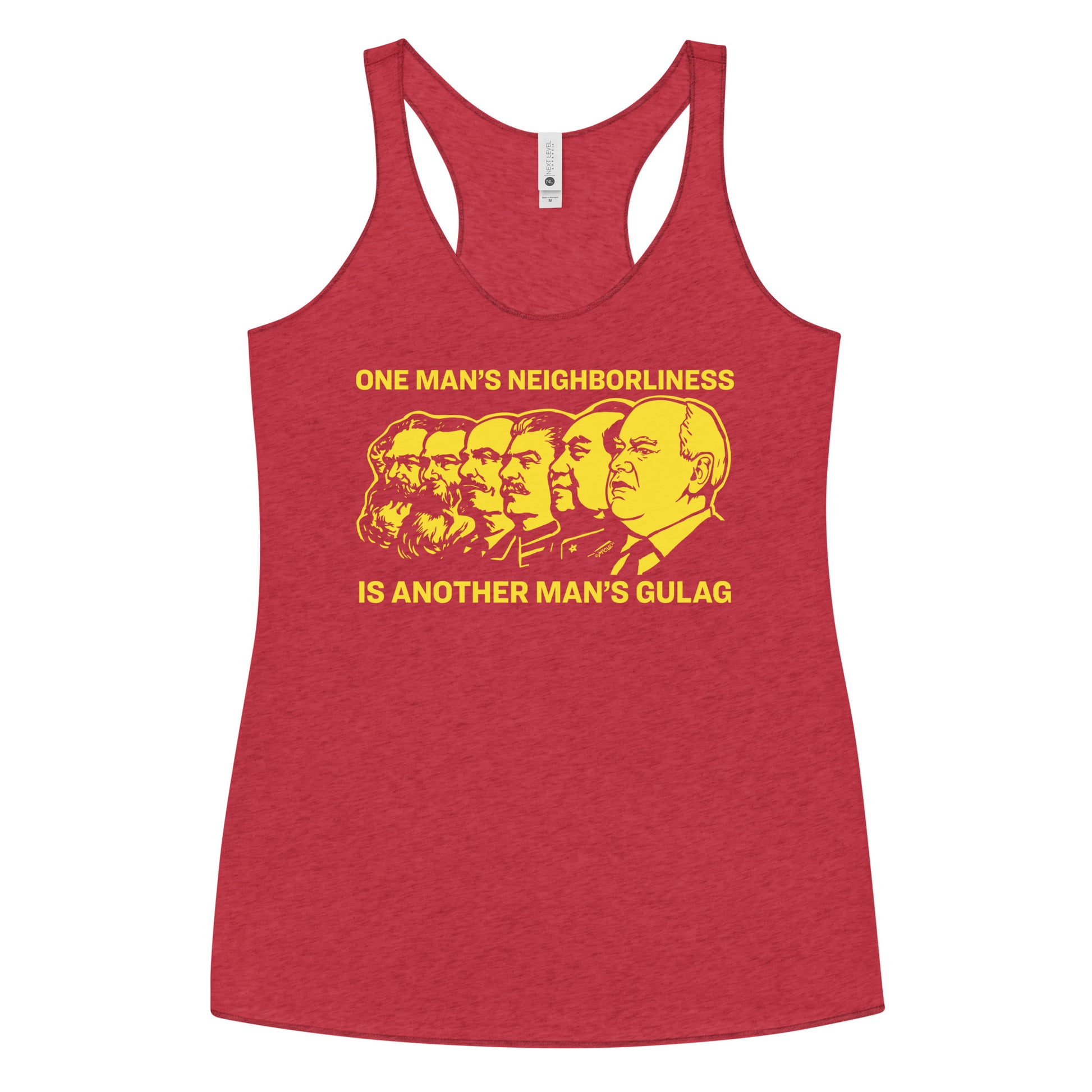 One man's socialism is another man's neighborliness. One man's neighborliness is another man's gulag, comrades. This racerback tank is soft, lightweight, and form-fitting with a flattering cut and raw edge seams for an edgy touch.